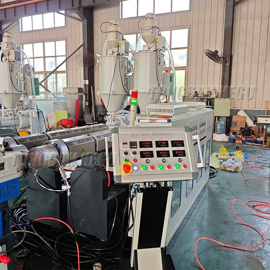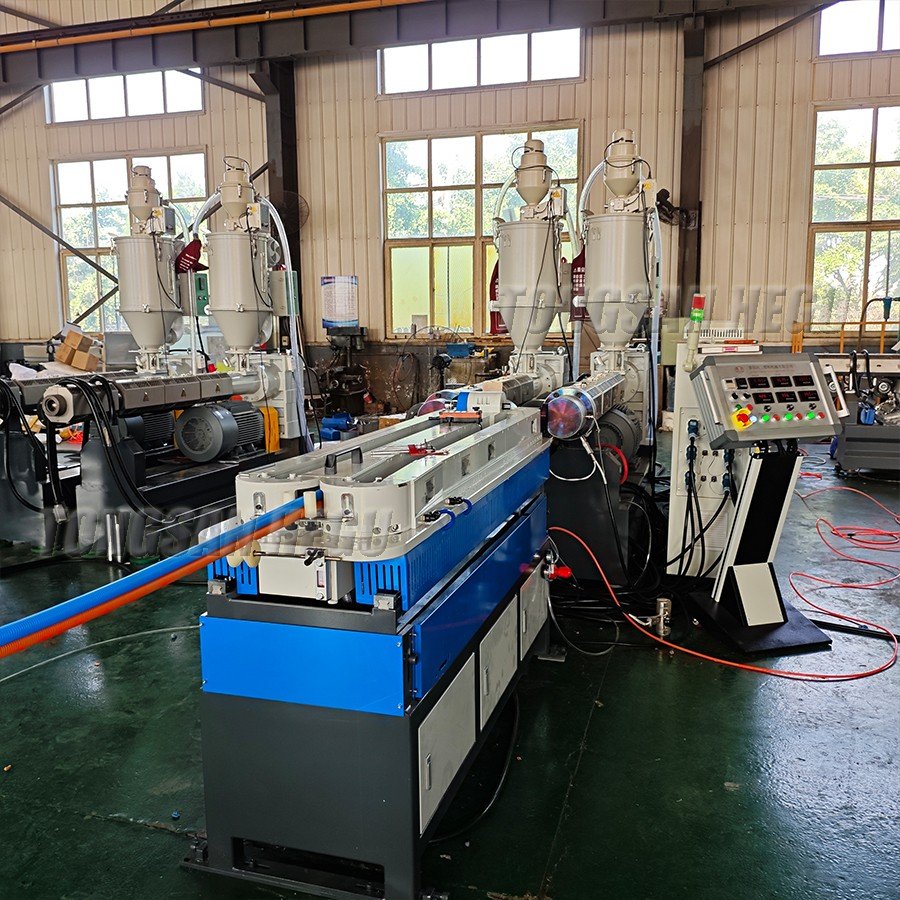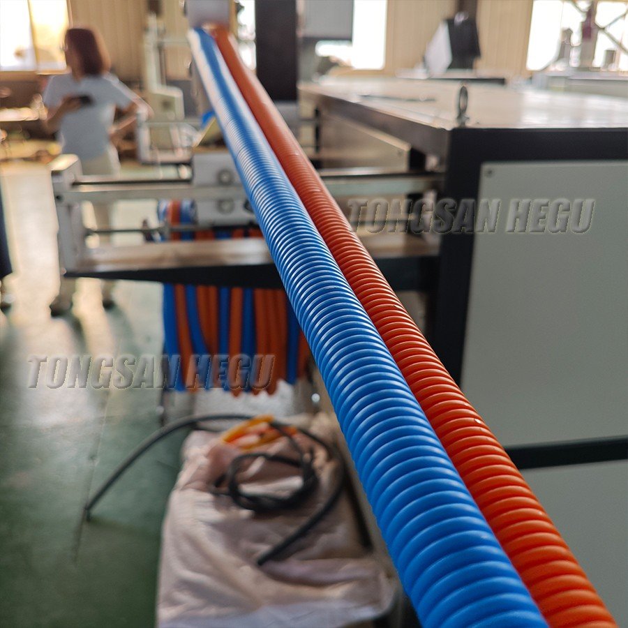 High speed single wall corrugated pipe extrusion line can produce PE, PP, PVC, PA corrugated pipes in 30 meters per minute.