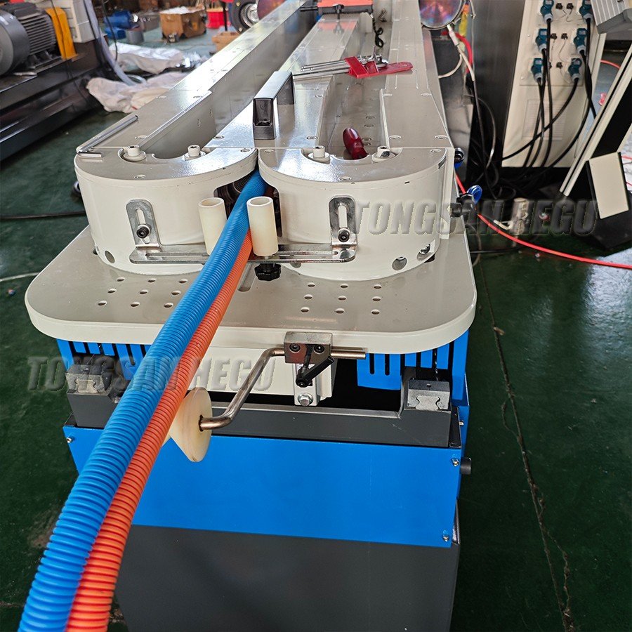 The high speed molding machine can equip with double cavities mould. In the production, by adjust the molding machine up and down to produce corrugated pipe of different diameters.